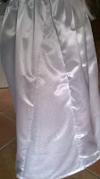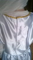 Et voici ma fille sous toutes les coutures et avec sa perruque blanche choisie par ses soins (sans commentaires de ma part donc...). J'ai réalisé le patron en le modifiant car le corsage de la reine blanche est en pointe et j'ai pris du 10 ans pour ma fille qui sort tout juste du 08 ans. Il est donc un peu large ce déguisement pas je ne l'ai pas ajusté volontairement sachant qu'elle allait mettre deux couches de vêtements en dessous. Cette robe est réalisée en satin blanc et tulle plumetis de chez Mondial Tissus ainsi que des petits galons décoratifs, et elle est refermée à l'aide d'un scratch au dos.